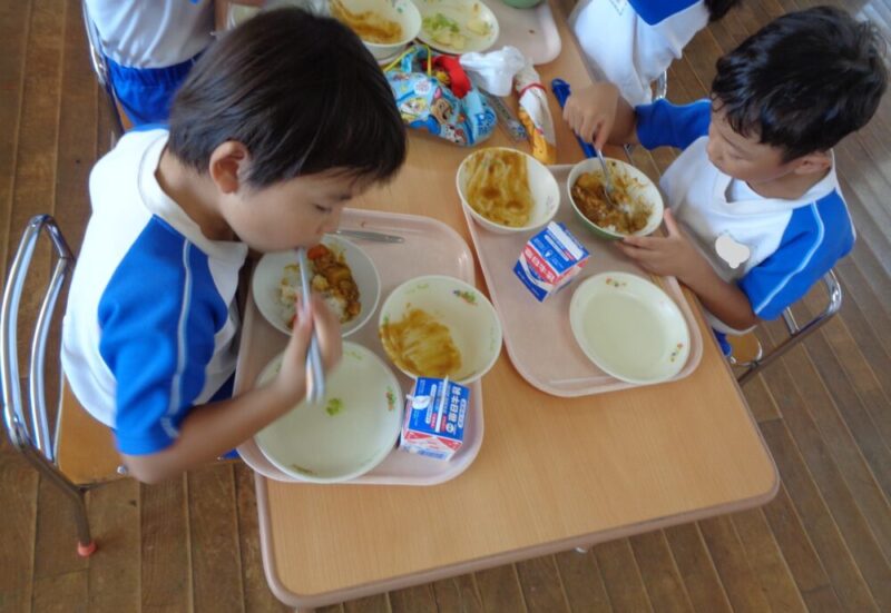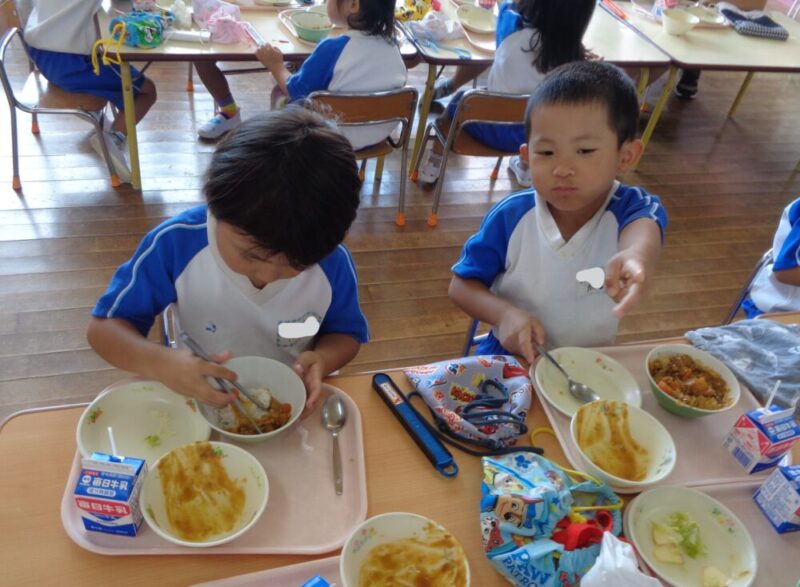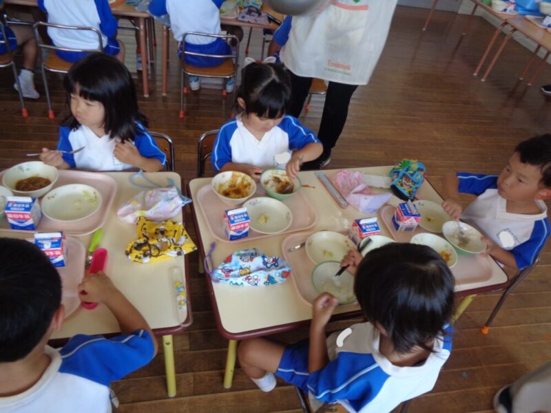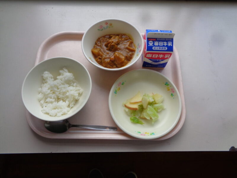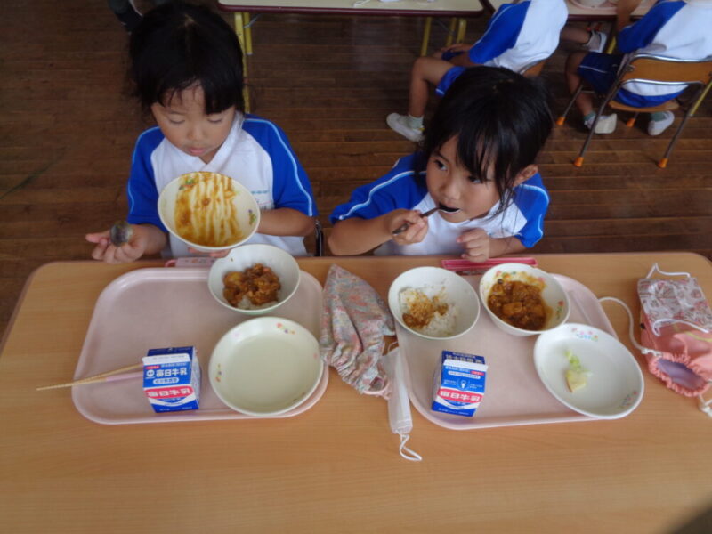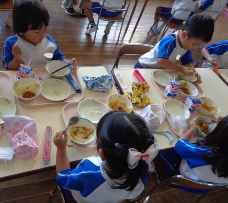 今日の献立は『秋味のカレー・りんごサラダ』です。秋味カレーは、秋の野菜が入っていました。エリンギはコリコリした食感がアクセントになって、サツマイモもすごく甘く、口の中で秋を感じて美味しかったです。秋味カレーを食べながら「私、秋が好きなんよな~」「そうなんだ~私はやっばり冬かな~サンタさんくるし」など、5歳児は季節の話で盛りあがっていました。3歳児も「このカレー好き」「もっとおかわり!!」と、とても気に入っていました。食材の味や季節を感じながら、友達や先生と一緒に食べるカレーは子供たちに大人気でした。