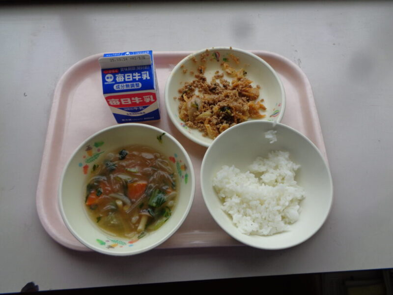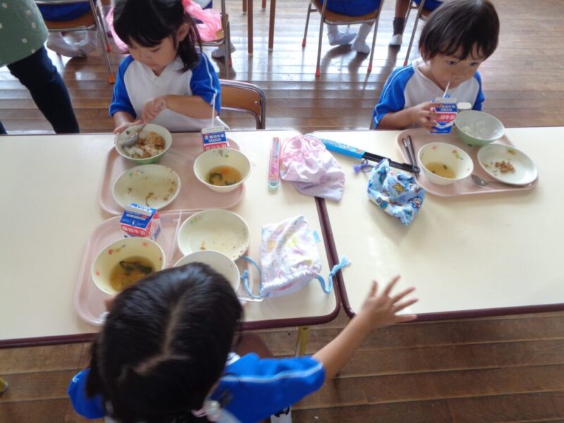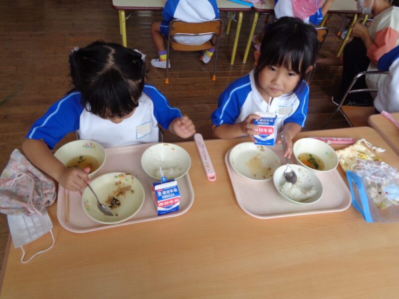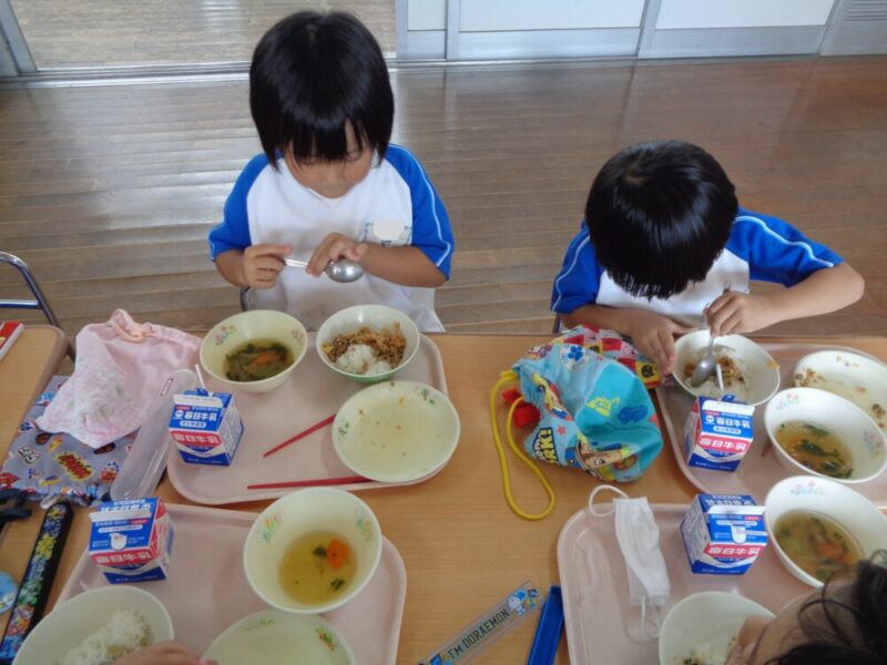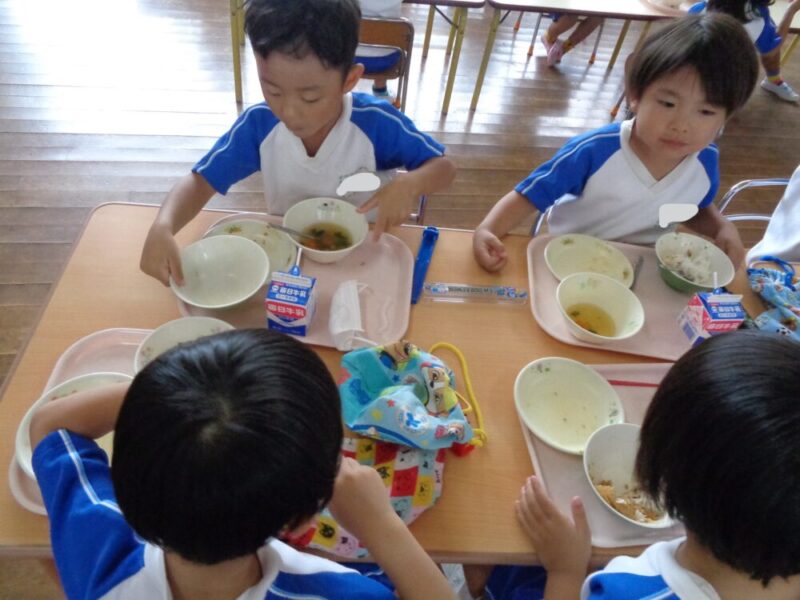 今日は子供たちに人気のビビンバです。ごはんの上に甘辛い味の色どりのいい野菜をのをせると「おいしい!!」「ちょっとピリ辛」「ピリ辛って聞いたことある」「どんな意味?」「ちょっとだけ辛いっていう意味なんよ」友達同士で話しています。先生が「ビビンバって韓国のお料理なんだって」と紹介すると「韓国知ってる」「韓国って辛いで」「キムチも韓国」「〇〇先生も韓国に行ったことあるんやって」「じゃあ、KARAの人にあったん?」給食を食べながら、韓国という国にも関心が広がっていました。そして、「ピリ辛のん、ほんと美味しいね」と、ご飯と混ぜながら、美味しそうに食べていました。