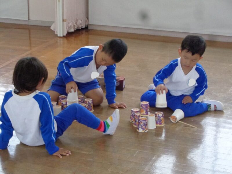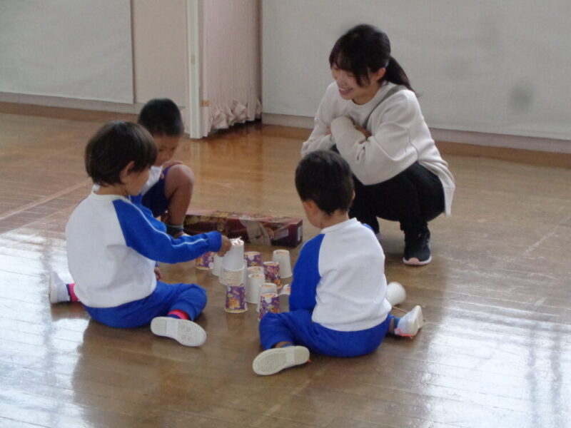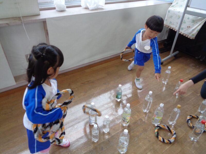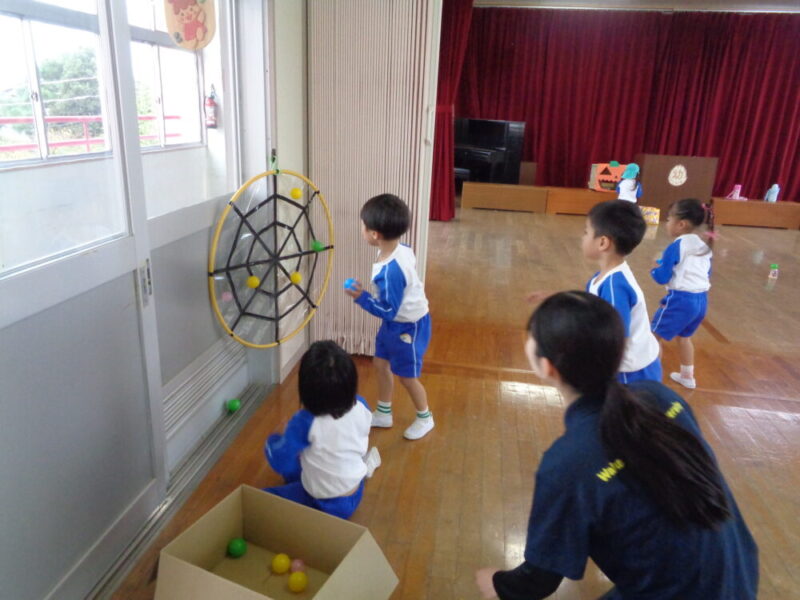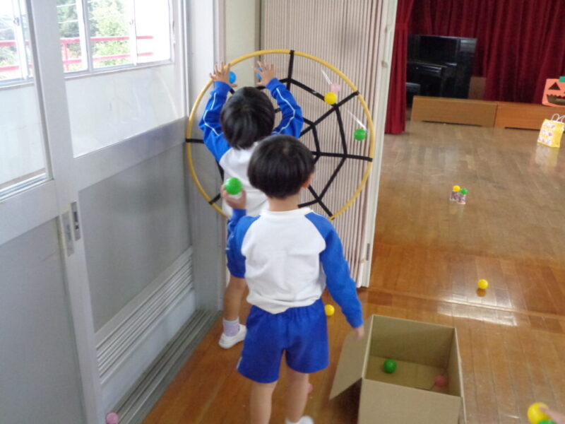 先日のおうちの方が主催してくれたイベントが楽しかったようで、今日は、子供たちだけで楽しんでいました。自分たちで場所や位置を変えて工夫したり「前は、挑戦したら、スタンプ押してくれたで」「だからスタンプほしいな」など、おうちの方がしていた役をやってみたりして楽しんでいました。おうちの方の楽しそうにしている姿に刺激を受けて、自分たちの遊びへと広げていく姿が見られていました。