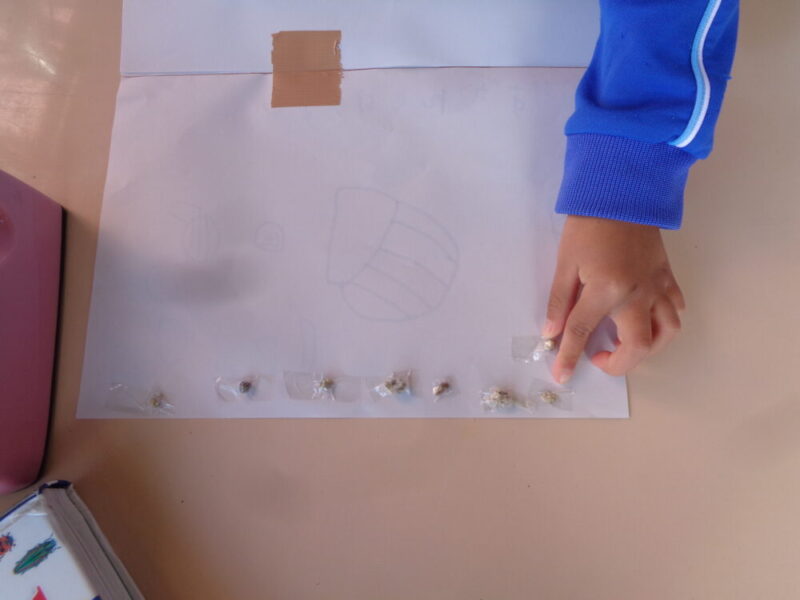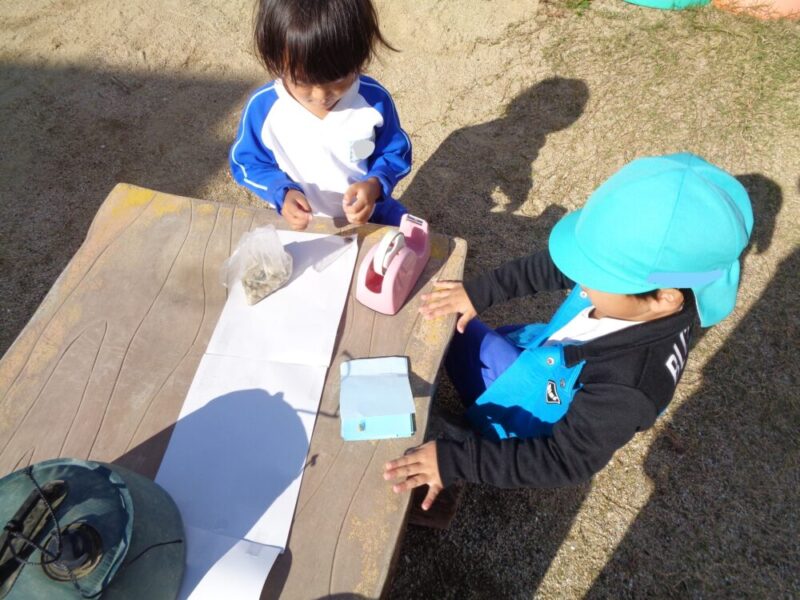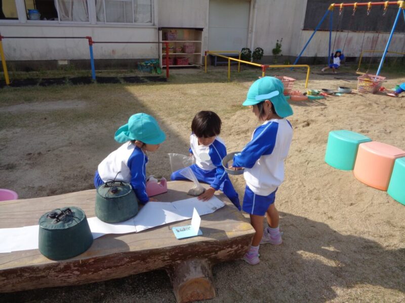 そのうちに砂場の砂にまじっている貝を見つけて「これも図鑑にいれよう」と、貝の図鑑を作り出す子もでてきました。