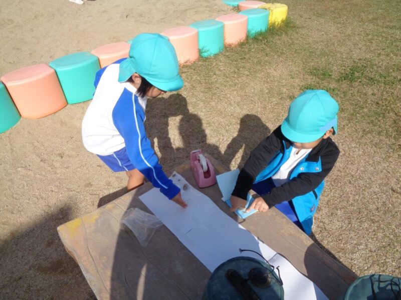 先日からいろんな石を集めていた子供たちが、「この石きれいだから、紙に貼っていこう」と、少しずつ貼っています。「これさ~もっと集めたら図鑑になるんじゃない」「図鑑にしようよ」と、図鑑づくりが始まりました。紙を長くつなげていくタイプのものもあれば、本の形をしたもあり、オリジナルの図鑑です。初めは自分の見つけた石だけでしたが、「いい石あったら、図鑑にのせるからもってきてよ」と、周りの子にも声をかけると「いいのあったで、これもどう?」と、いろんな石をもってきてくれていました。「この石、まるまるでしょ」「この色きれいね」「面白い形!」どれも自慢の石です。