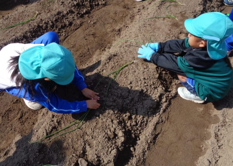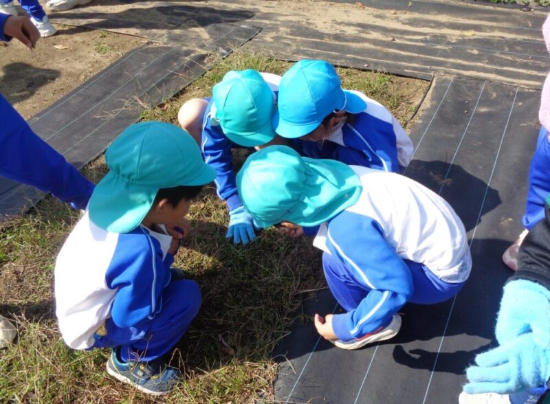 畑には、虫が住みやすいようにあえて草を生やしているところもあります。玉ねぎの植え付けが終わると今度は虫探しです。最近少なくなってきた虫をみんなで探していました。