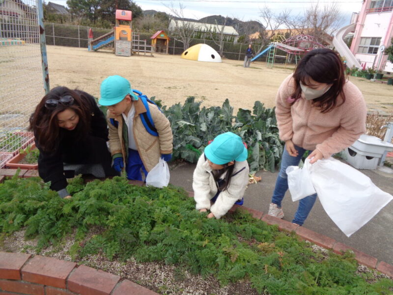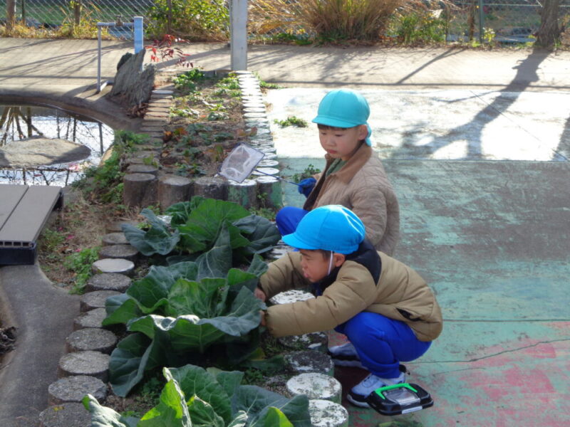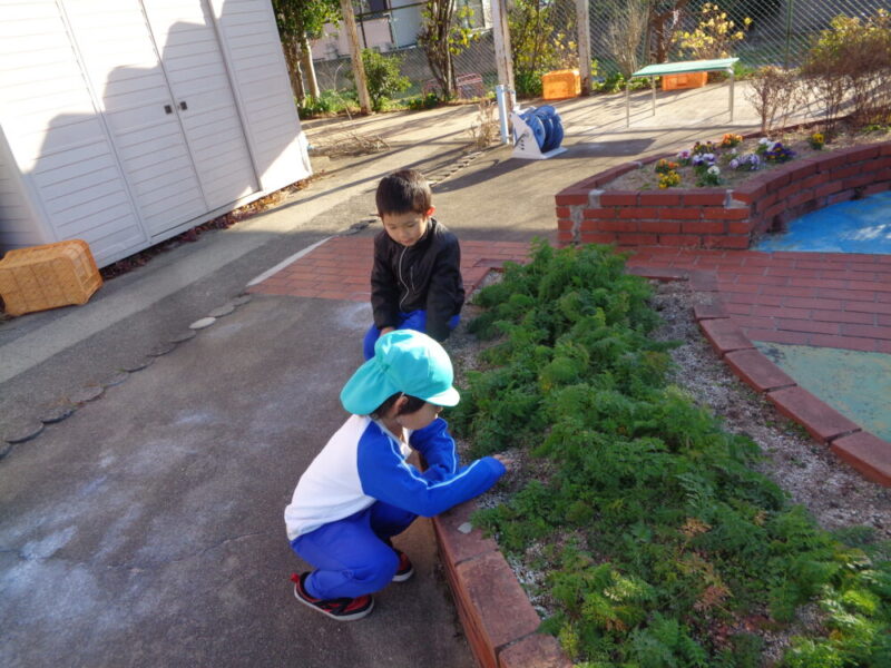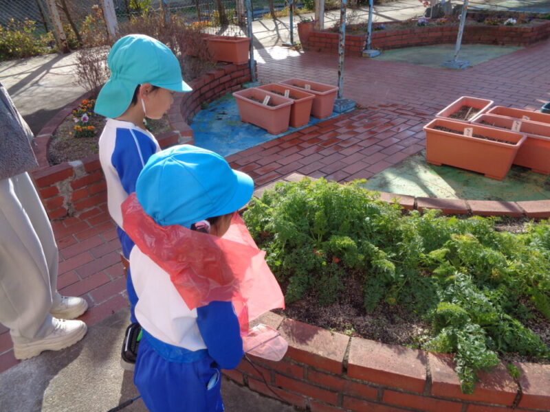 久しぶりの幼稚園で「あれ!?ブランコの下のとこ変わってる」「大根もすっごく大きくなってる」「ブロッコリーも出てきたよ」「王様の金魚は元気かな」「ニンジンすっごく大きい」冬休み前から変化してるところを友達と見つけていました。 降園時には、おうちの方と一緒に大きく育った大根や人参を収穫していました。