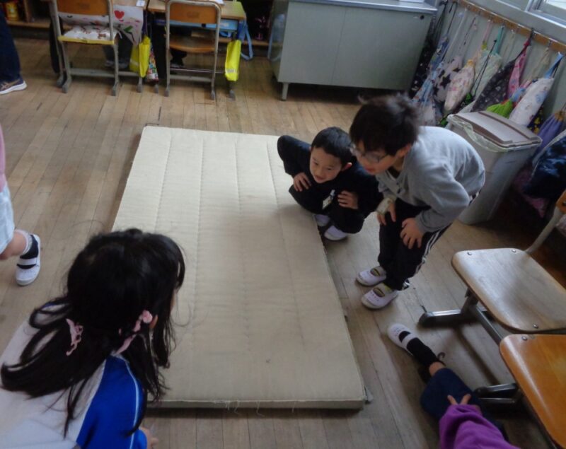 給食の配膳の仕方、掃除の仕方、牛乳パックの畳み方、ランドセルを背負うコーナー、体育のマットでの運動の仕方、学校のいろんな先生のことを教えてくれるコーナー、鉛筆の持ち方を教えてくれるコーナーもありました。