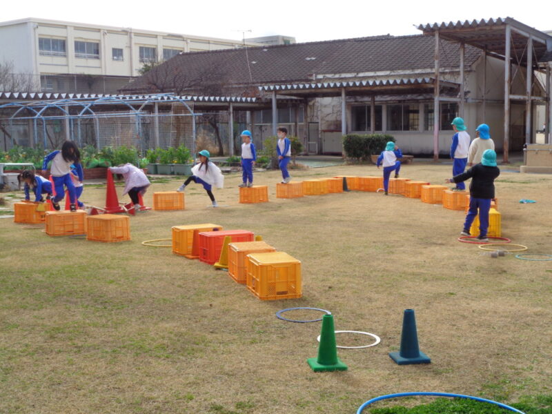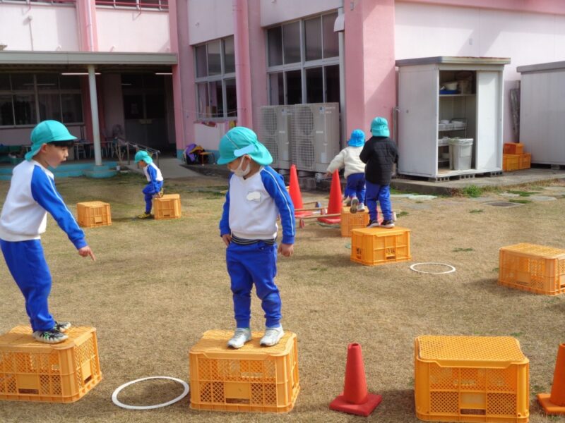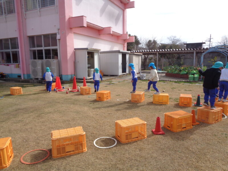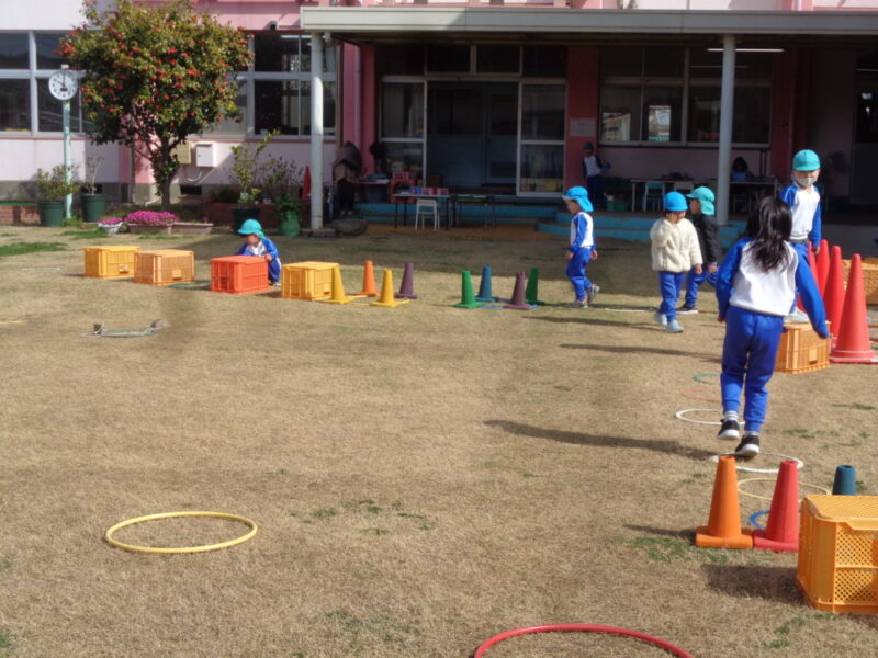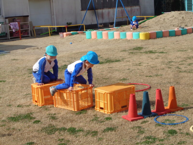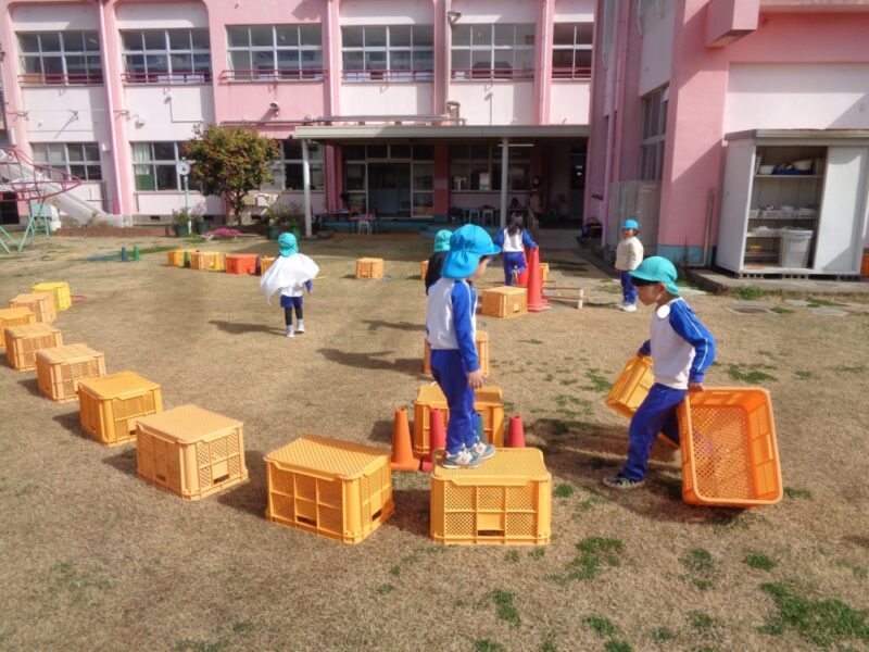 園庭で、フープ、コーン、コンテナを使って自分たちで遊ぶところを作っていきます。「こっちにコーンおいてね」「コンテナはここにしようよ」友達と声をかけあいながら置く場所を決めて、遊び場を作っていきます。自分たちで相談し遊びを形にしていくことは楽しいようです。身近な用具も子供たちのアイデアによって面白い楽しい遊びになり、「おもしろそう」と、一緒にする友達も集まってきました。