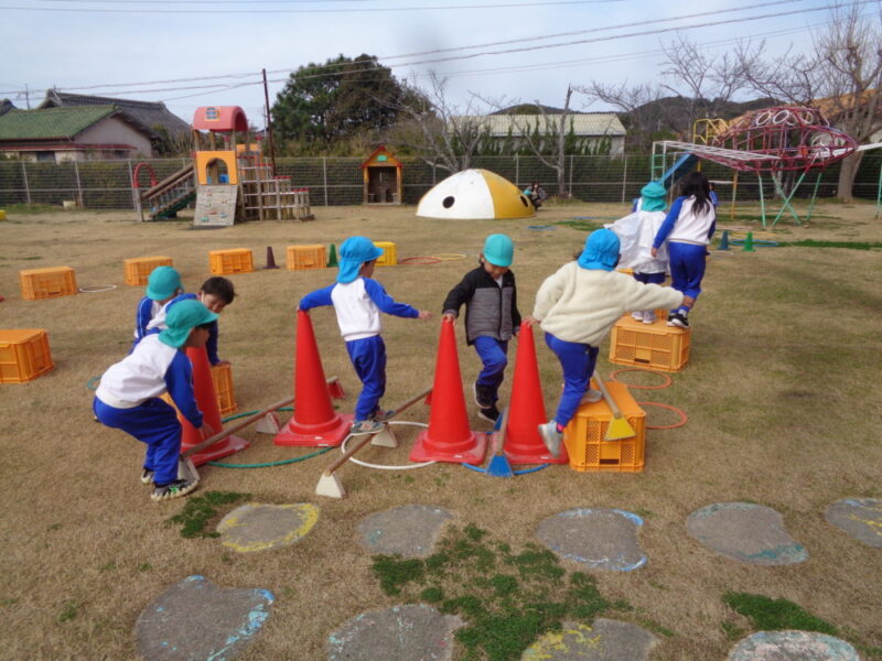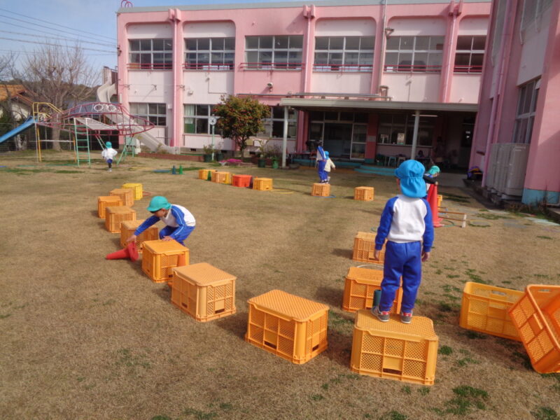 遊んでいる中で色んなイメージも広がり、「ここに落ちたらあかんよ」「マグマがでてくるから」「ワニに捕まるよ」と、バランスを取りながらゆっくり進んだりしています。「じゃあ、ももさん(3歳児)が落ちないように、ここにフープもうひとつおくわ」、友達のことにも気にかけながら、並べ替えたり、渡る場所を考えたりしながら、遊びがさらに広がっていました。