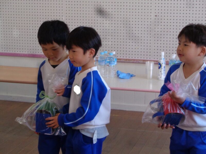 今日は3,4歳児が、5歳児ゆり組さんに、「おめでとう」「ありがとう」の気持ちを込めて手作りのランドセルをプレゼントしました。
