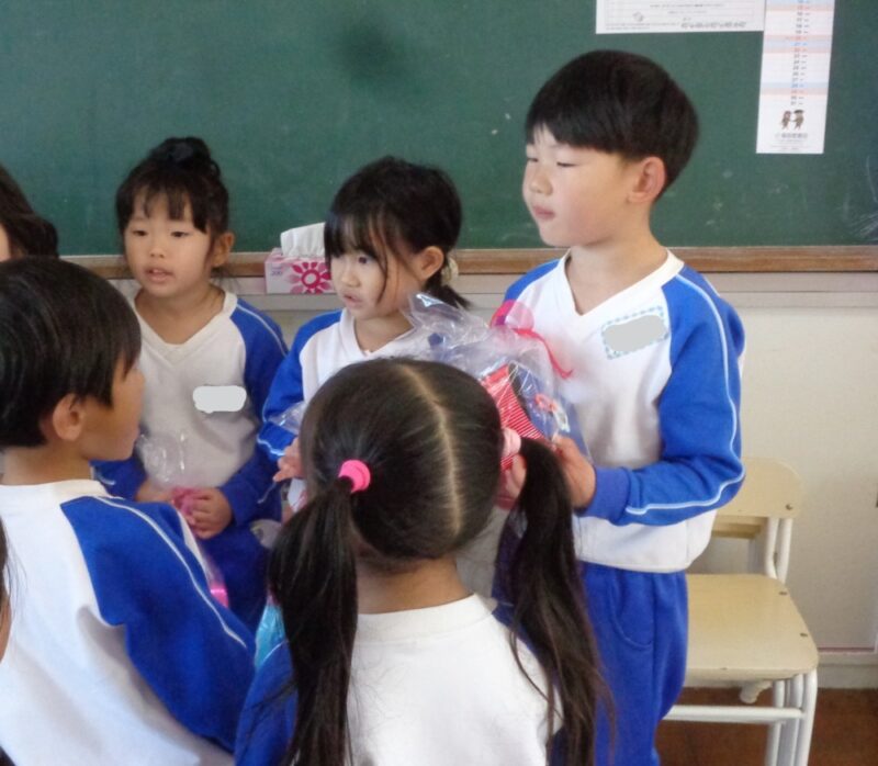 このランドセルの中には、3,4歳児からのお手紙やプレゼントが入っています。お手紙やプレゼントを作っているときにも、「これは〇〇ちゃんに渡すんだ~」「いっぱい遊んでもらったんよな~」など、5歳児とことを思いながら作っていました。