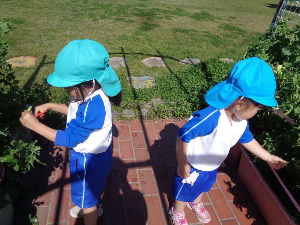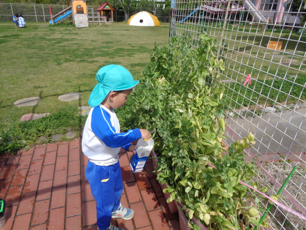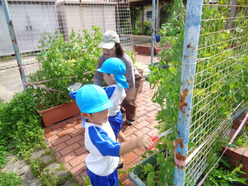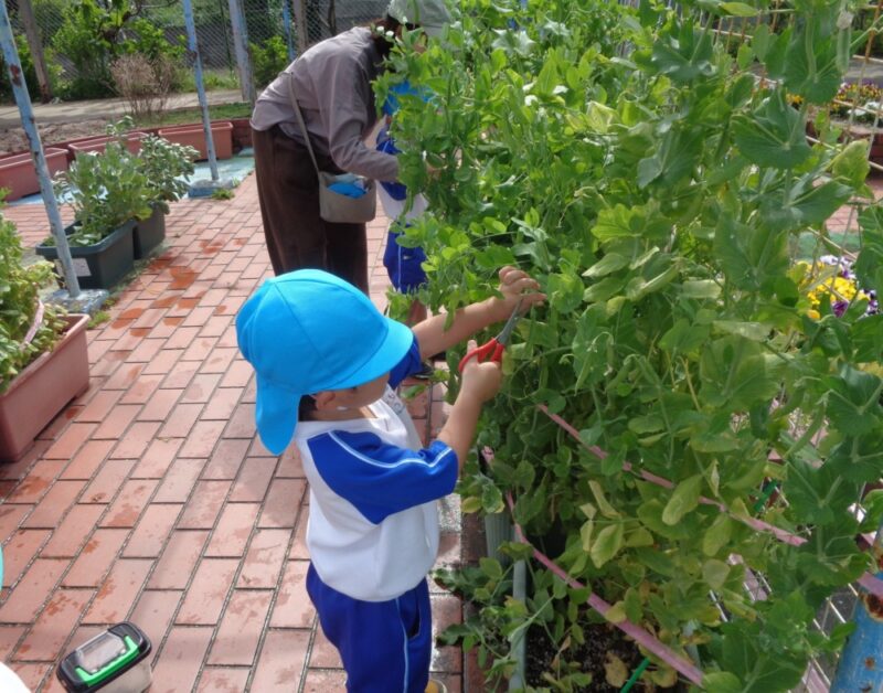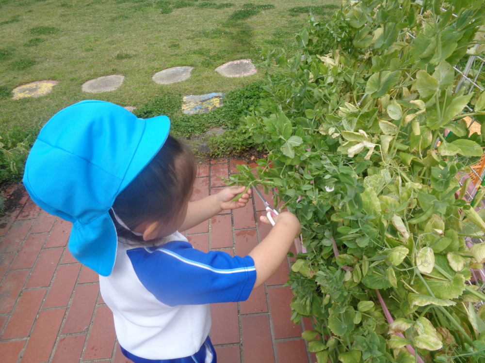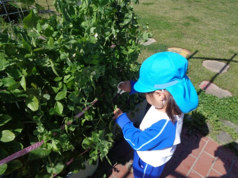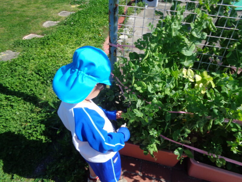 スナップエンドウをおうちに持って帰るんだ 投稿日:2026年4月24日2026年4月24日 園のスナップエンドウを大事にそうに収穫しています。「これは、ママの分、パパの分・・・」とおうちのを思い出しながら、家族の分をとっています。家族の顔を思い出しながら、採っている姿はとても微笑ましいです。保護者の方からも「これはママの分で、この小さいのはパパのだからと、ひとつひとつ説明してくれていました。家族で美味しくいただきました」と話してくれていました。 園での体験が、家庭でも話題になるのは、とても嬉しいつながりですね。