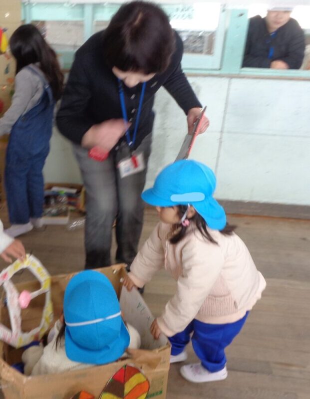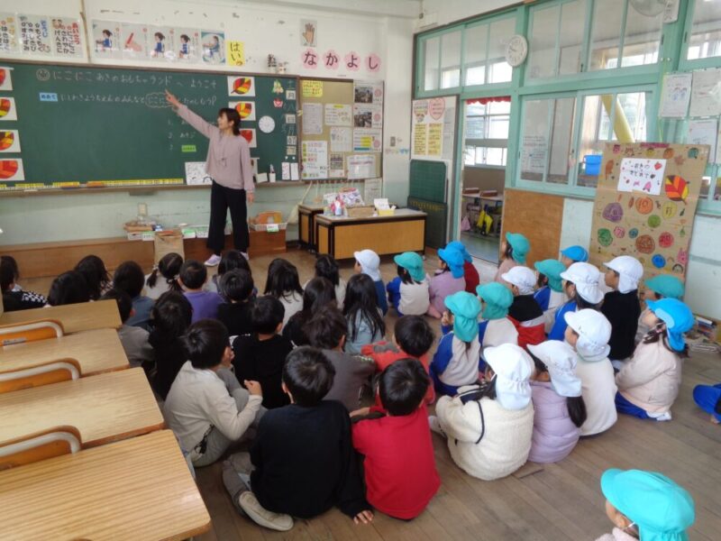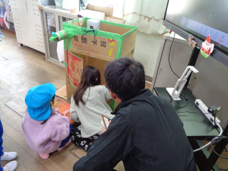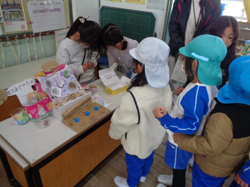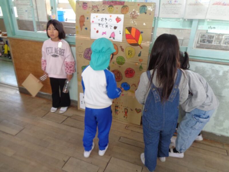 魚釣りのところも「頑張れ!もう少しやで」と応援してくれる一年生。幼稚園の子供が楽しめるようにしてくれていました。一年生の先生が幼稚園の子供たちに「今日はどうでしたか?」と尋ねると、「楽しかったので、またぜひ呼んでください」「牛に餌やりとまとあてが楽しかったです」「また、今度、幼稚園でもおもちゃを作るので来てください」(ちょっと、先生たちはびっくり!!)と、今日の感想を伝えていました。一年生は「幼稚園のみんなが楽しく遊んでくれているのが嬉しかったです」といってくれていて、今日の一年生のめあて『ようちえんのみんあと秋の手作りおもちゃをにこにこでたのしもう!』は達成です。