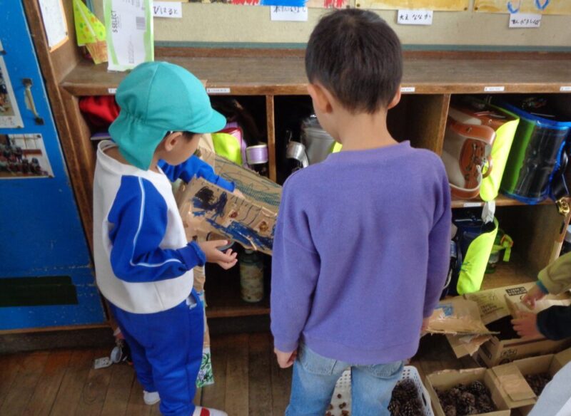 3歳児も同じようにナイロンに数珠玉をいれて飛ばそうとしていると、5歳時が「それは無理やで~いれたら飛ばんで」とアドバイスしていましたが、3歳児は「大丈夫」といって飛ばしにいきました。いつもならたぶん飛ばないかもしれませんが、今日の強風は、数珠玉入のナイロン袋も飛ばします。5歳児も「うわー飛んでるわ」と少し驚いていました。