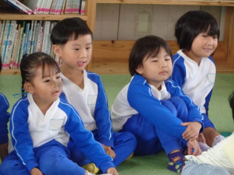 優しい雰囲気で絵本を読んでくれると、子供たちも絵本のお話の世界へ引き込まれていました。今日は未就園児『ひよこ組』もあったので、ひよこ組のお友達も一緒に参加さしてくれていました。はじめは緊張していた高校生のお姉さんたちも、少しずつリラックスして、手遊びやエプロンシアターもしてくれました。子供たちも「また来てほしい」「面白かった」と嬉しそうでした。
