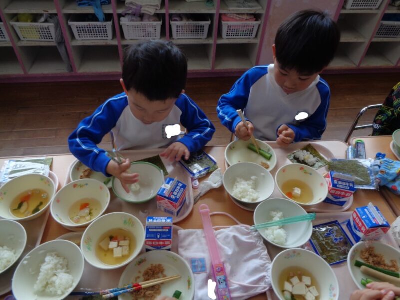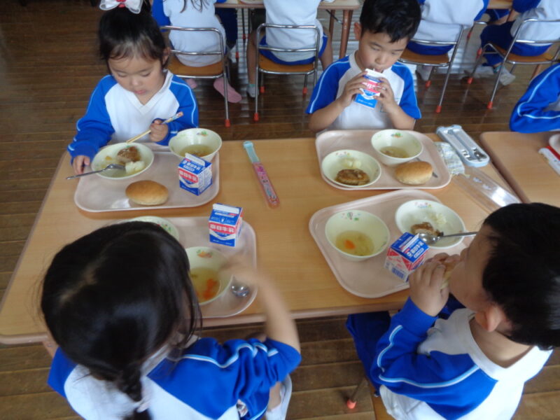 今日で、5歳児ゆり組にとっては、幼稚園で給食をいただくのは最後の日になりました。3歳児もも組の時は、小さい手で、一生懸命お箸をもっていた姿を思いだします。今では小さいものでも上手につかめるようになりました。牛乳の入れ物の小さくたためるようにもなりました。