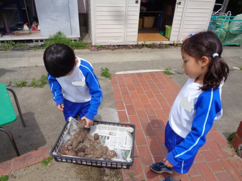 里芋は、あまり見たことがないのか「これ何?」「お芋?」と、子どもたちは珍しいようでした。植える向きがあることを知らせると「こっちむき?」「とんがってる方が上向きなのかな」向きを確かめながら、土の中に植えていました。土の中で少しすづ育っていく様子を楽しみたいと思います。