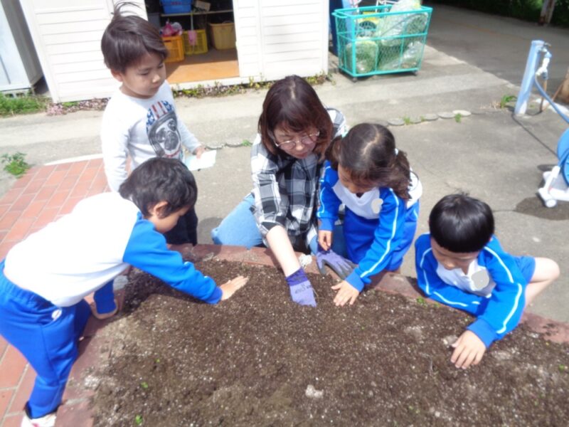4歳児すみれ組も3歳児のときは、あまり、よく分からないままに経験していた子も、今年は「ここにふたつ入れるんだね」と、種を大事そうに土の中へ埋めていました。