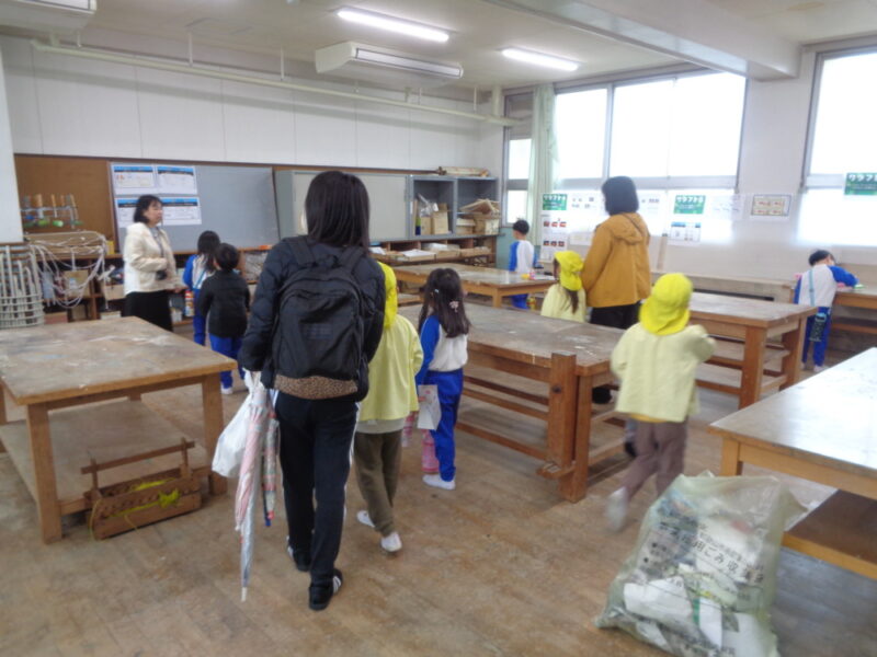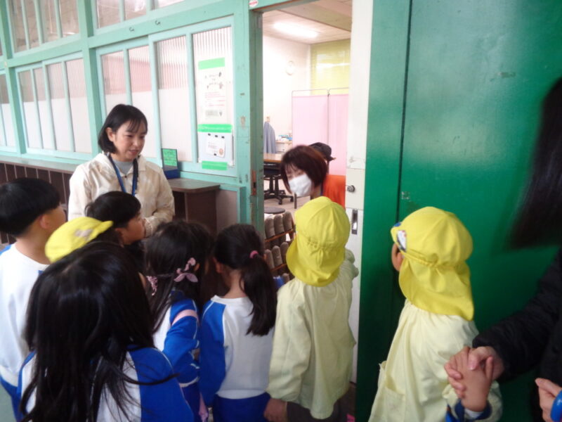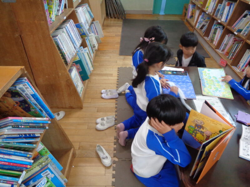 校舎の中は広くて「今何階にいるのか、わからなくなってきた」「迷子になりそう」といいながら見学しました。教室で、学習している姿を見たり、廊下にある飼育物に関心を寄せている姿もありました。図書室では、「いっぱいある!!」と、本を見せてもらいました。そして読んだ本は元の場所に戻すこと教えてもらいました。