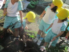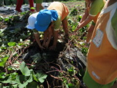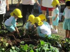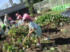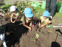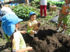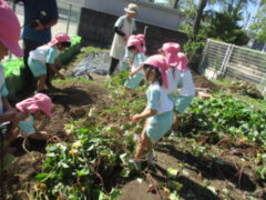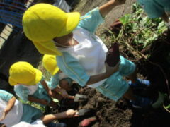 ツルの先の根っこにたくさんのイモが付いてきたり、プチっと切れたところを掘ってみたりと、子供たちは歓声をあげながら楽しみました。