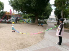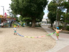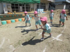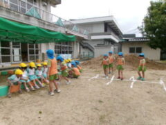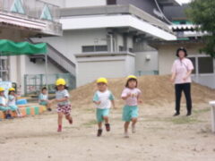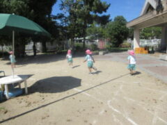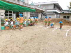 自分たちで白線を書いてスターターもゴールもしています。きく組さんは、「かけっこ」の面白さに夢中になっていました。