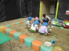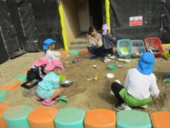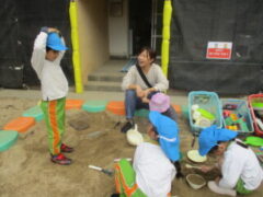 砂場では、お兄ちゃんやお姉ちゃんたちと一緒にご馳走を作ったり、型を押したりして遊びます。