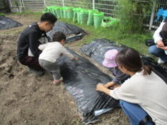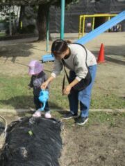 前回は、サツマイモ堀りとダイコンの種まきをしましたが、今日はダイコンに水やりをしました。今日来てくれた友達は、ダイコンの種をまきました。