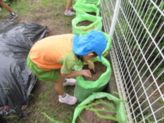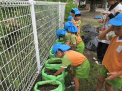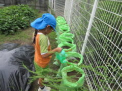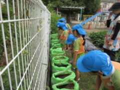 毎日、遊んだ後はクラスで水やりをしたり、草引きをしたりして自分たちで植えた野菜の成長をしっかりとサポートしています。お世話をすると美味しい野菜が出来ることを知っているのでしょうか。