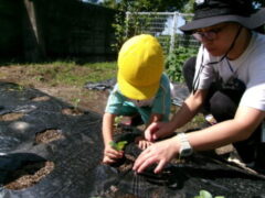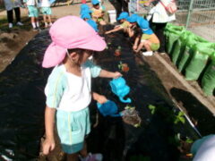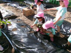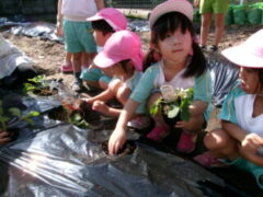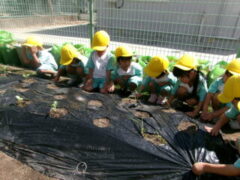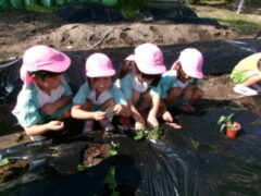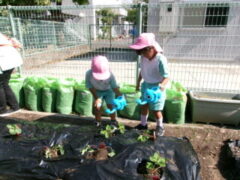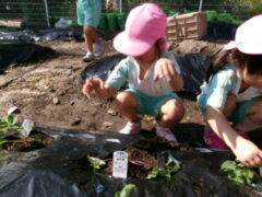 イチゴを食べたことがある子供は、この畑で緑から白、赤くなるまでまだかまだかと待って、出来たイチゴをとり、食べたことを思い出しているかもしれません。また、春キャベツでお好み焼きを作って食べたけど、メキャベツってどうやって食べるのかな?と、思いを巡らせているのかもしれません。園での食育が浅いたんぽぽ組さんにとっては、知っている「ニンジン」の形をイメージしながら植えているかもしれません。そのような子供たちの思いを、職員も想像しながら一緒に楽しんで、栽培、収穫していきたいと考えています。