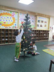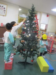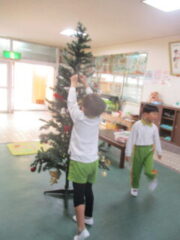 「これ、飾ってもいいの?」「飾りたーい。」「すぐ来るね。」と言って身支度を終えた子供たちは、入れ替わり立ち替わりやってきて、きれいに飾り付けをしてくれました。