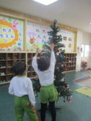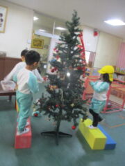 「えー?作ってくれたの?」「うん!!」「ありがとう!!」子供たちが見守る中、無事にツリーの一番上に星を付けることが出来ました。そしてやっと、ツリーが完成しました。