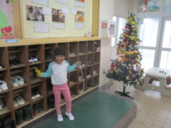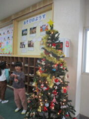 朝登園すると、玄関に大きなクリスマスツリーがありました。