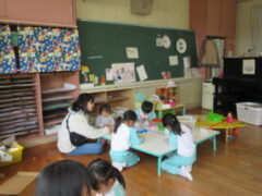たんぽぽ組のお部屋で遊んでいます。ままごとや積木など、たんぽぽ組さんの友達も近くで遊んでにぎやかでしたよ。