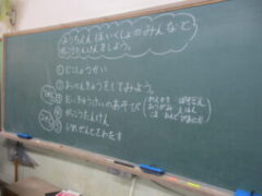 今日の予定を書いてくれています。自己紹介、勉強をしよう。大休憩遊ぼう。学校探検をしよう。おみやげをもらう。