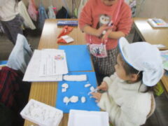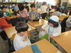 1年生は、A組さんとB組さんの2クラス。きく組さんも、保育所のぞう組さんも2つに分かれて、まずは教室に入ってペアの1年生のお友達に色々教えてもらいました。