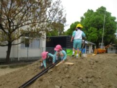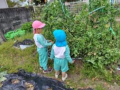 畑では、5歳児さんが3歳児さんに豆を育てていて、大きくなったら収穫して食べることを教えてあげていました。