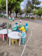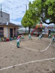 進級した4歳児(ゆり組)5歳児(きく組)の子供たちは、始業式が終わると早速園庭に出て、元気いっぱい遊んでいました。