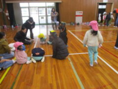 準備が出来たので、ゆり組さんから遊びに行かせてもらいました。たんぽぽ組さん、きく組さんも集まり、遊戯室はにぎやかに、でもみんなが1年B組さんが準備してくれた遊びに夢中になって遊んでいました。最初は、「どこから遊びに行こうかな。」と、戸惑っていた様子も見られましたが、1年生がやさしくかかわってくれたので、すぐに楽しめていました。