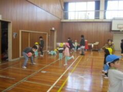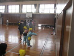 ペアに分かれて、みんなで体育館で遊ぶ時の約束をすると、すぐにしたい遊びを見つけて遊び始めました。
