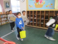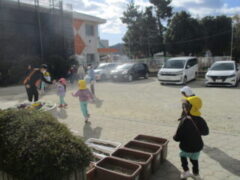 さて、ここからはみんなで園庭に出て「豆まき」をします!!