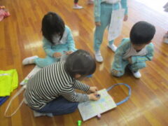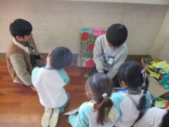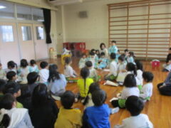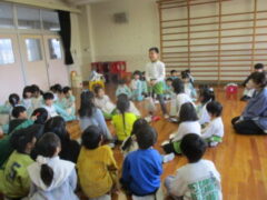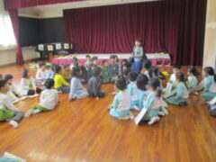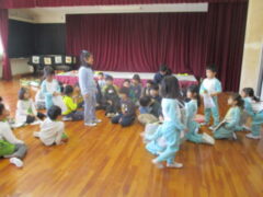 先生からのプレゼントは、「あなから みえるよ」の紙芝居です。クイズになっている内容で、子供たちは楽しそうでした。