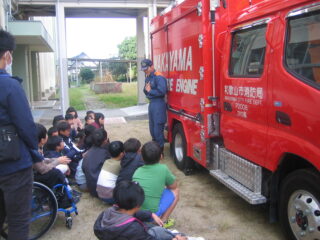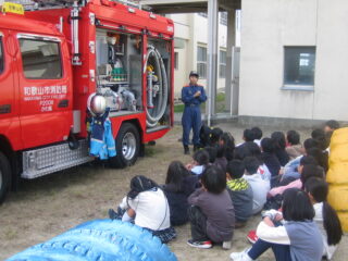 3年生は社会科の中で、自分たちのくらしを守る消防の仕事について学習をしています。そんな消防の仕事に日々従事されている和歌山市東消防署の消防士さんが消防車(ポンプ車)に乗って来てくださり、実際に消防の仕事に携わる方からお話を聞く機会をもちました。