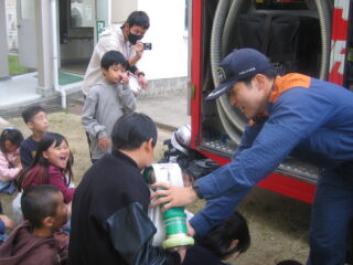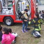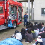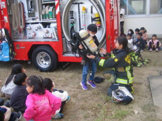普段している業務のこと、火災現場で着る服のことなどを聞き、400度の熱に耐える服であることや、酸素ボンベも背負うと20kg以上にもなることなどを知り、子供たちは驚いていました。また、ポンプ車の内部もじっくり観察でき、様々な装置が付いていることも知ることができました。
