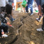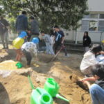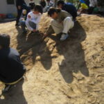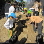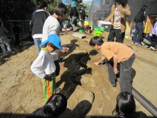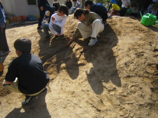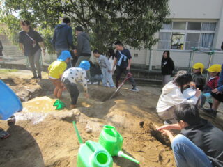 理科実験「流れる水の働き」5年 投稿日:2025年10月28日 5年生では、「流れる水の働き」の学習をします。曲がりくねった川の内側と外側で土が堆積するか、削れるかという実験です。西和佐小学校では、幼稚園にある築山を利用してこの実験をしています。 実験をしている5年生のそばで園児たちも興味津々です。実験の後は5年生たちが作った川を使って遊び始める園児もいました。こんなかかわりも素敵だと感じました。