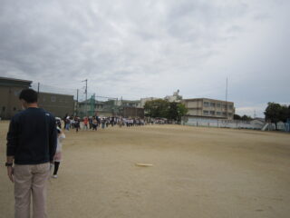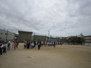 運動場に全員が集まった後、「和歌山市に大津波警報が発表されました。校舎の3階まで避難しましょう。」と、2次避難をしました。1次避難も2次避難も、「おさない はしらない しゃべらない もどらない」を守って真剣に訓練することができました。