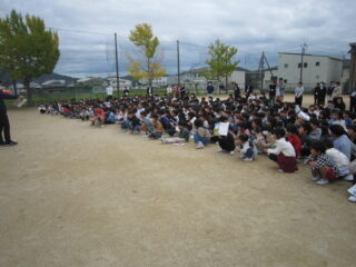 11月5日は「世界津波の日」です。毎年、この日に避難訓練をしています。10時になると、防災行政無線で緊急地震速報訓練放送が流れました。教頭先生から「地震が収まりました。安全のため運動場に集まりましょう。」の放送で、各クラス運動場に集まりました。西和佐幼稚園の園児も一緒に訓練しています。