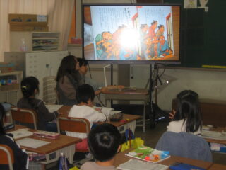 本を全部暗記して語ってくださるお話、大型絵本での読み聞かせ、紙芝居といろんな方法で聞かせてくださいました。子供達はとても集中して目を輝かせてみていました。