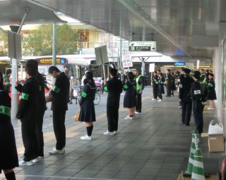 12月7日(水)の夕方、JR和歌山駅西口にて、本校の生徒会代表者が他校からの代表者とともに、和歌山東署管内年末年始特別警戒に伴う防犯啓発活動に参加してきました。行きかう人々に防犯を呼びかけました。