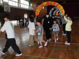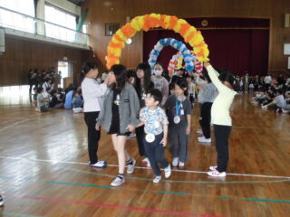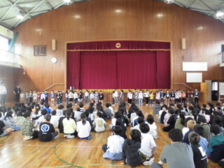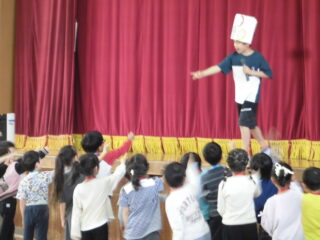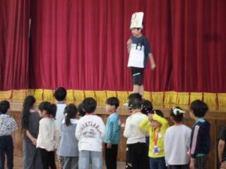 4月17日(金)「1年生を迎える集会(1限)」1年生の自己紹介と歌のあと、ジャンケンマンが登場して盛り上げてくれました。