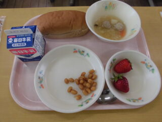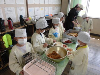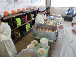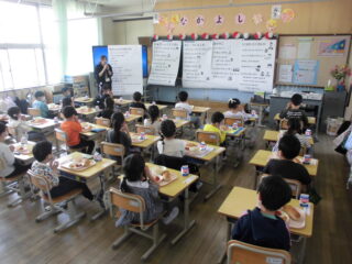 4月17日(金)「1年生 給食スタート!」給食当番の人もうまく配膳できました。