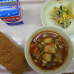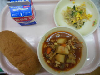 今日の献立は、はいがパン🍞。ポークビーンズ、こまつなサラダです。