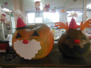 職員室前に飾っているお化けカボチャも、クリスマス用に変身しました🎅。