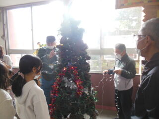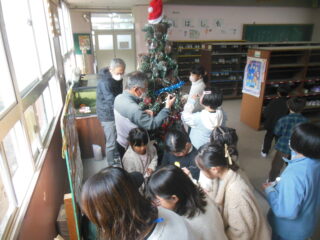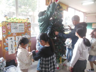 学校ボランティアさんのご協力の下、クリスマスツリーの飾りつけをしました。一気にクリスマスの雰囲気になりました🎅。